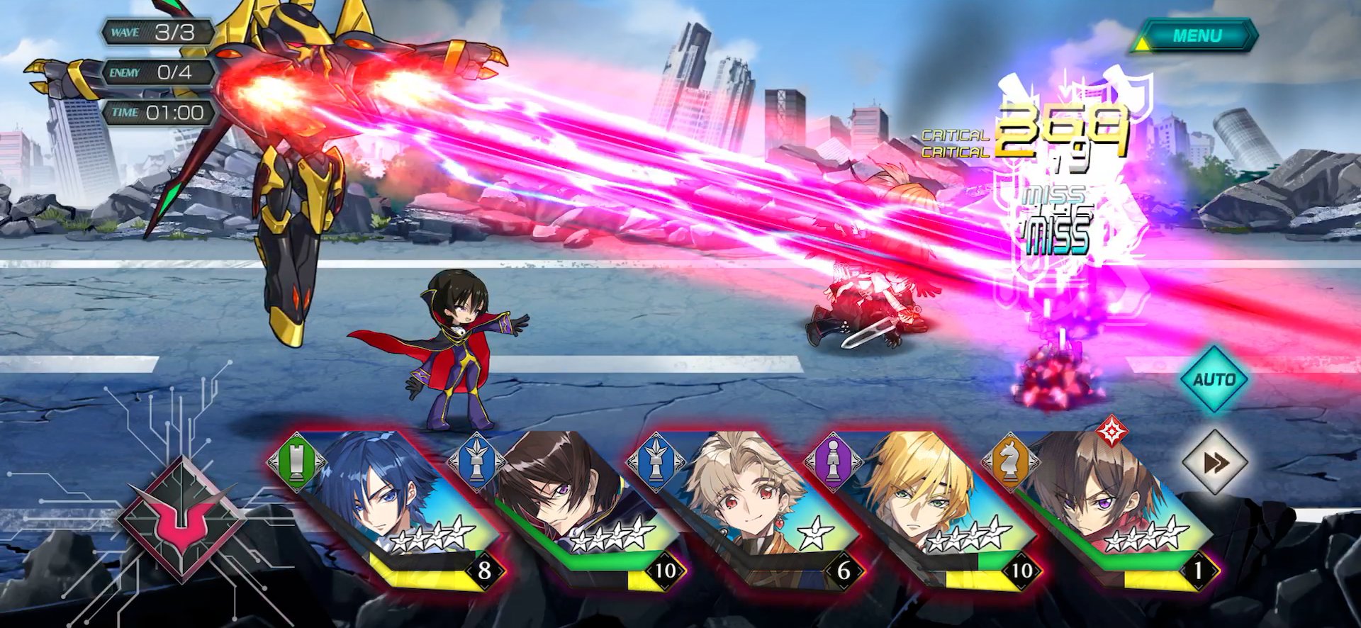 オートバトル機能もありますが、スキル以外の強力なゲージ技「ギアス」の発動だけは手動で行う必要があり、ギアスは原作同様にかなり強力な能力で、使うタイミングが重要になってくるのも面白いポイントです。