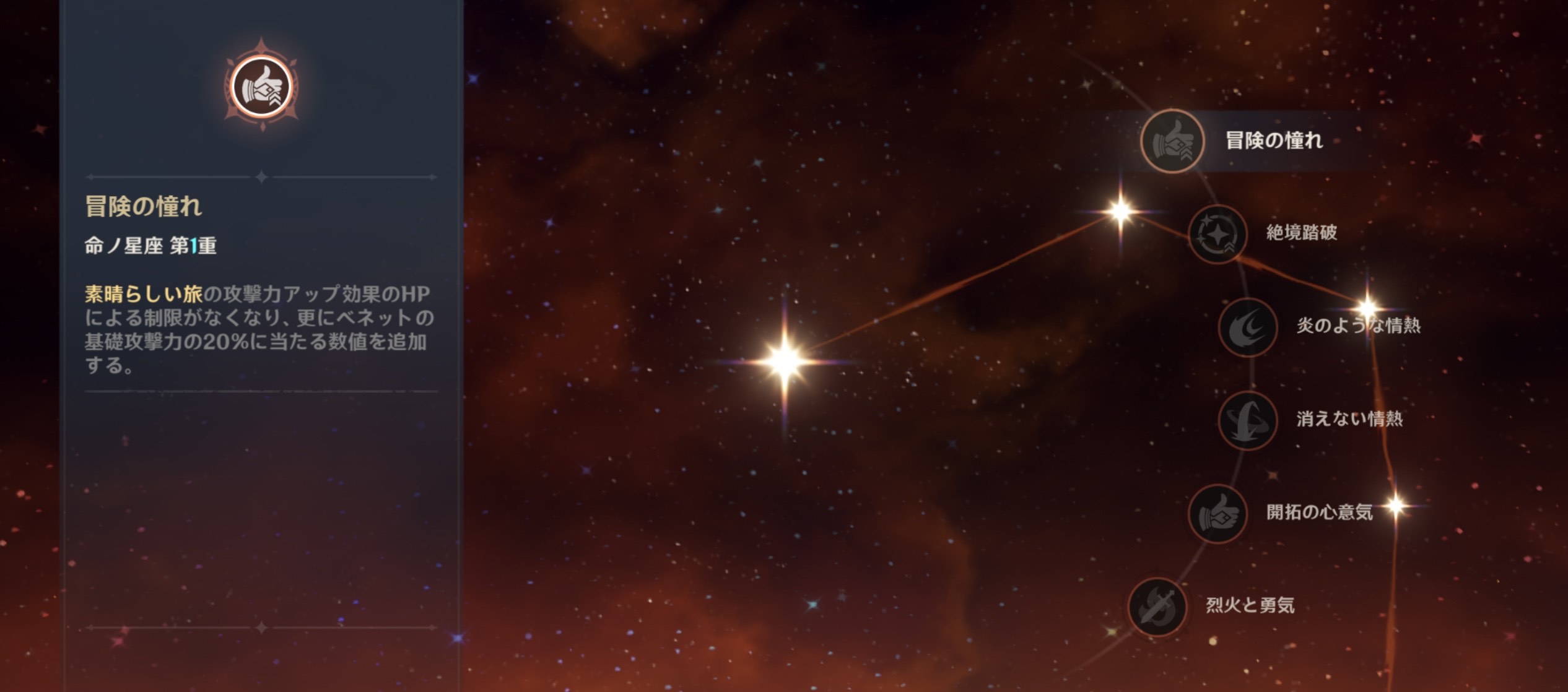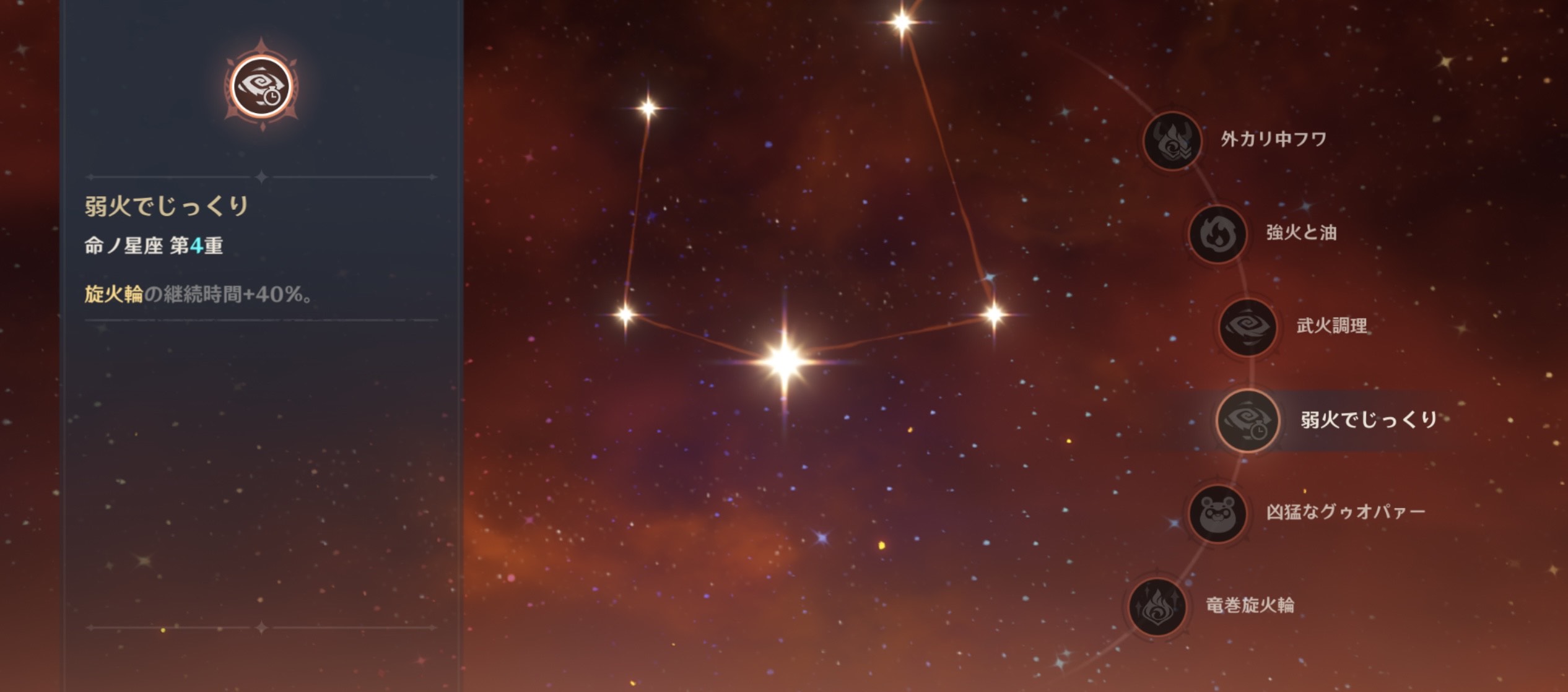 4凸効果は『旋火輪の継続時間+40%。』というもの。元素爆発の効果時間が増えることによってダメージ大幅に上がります。特にベネットとセットで使われることが多いので凸を進めていきましょう。