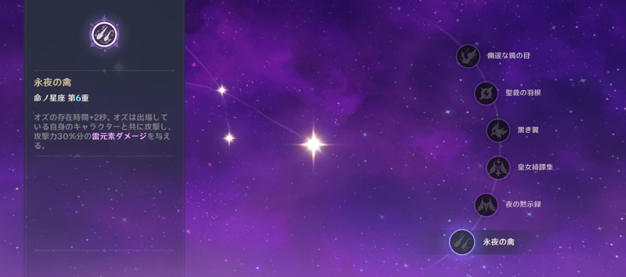 6凸効果は『オズの存在時間+2秒。オズは出場している自身のキャラクターと共に攻撃し、攻撃力30%分の雷元素ダメージを与える。』というもの。オズの存在時間上がることによってダメージが増えさらには追加ダメージも与えるという6凸らしい効果になっています。