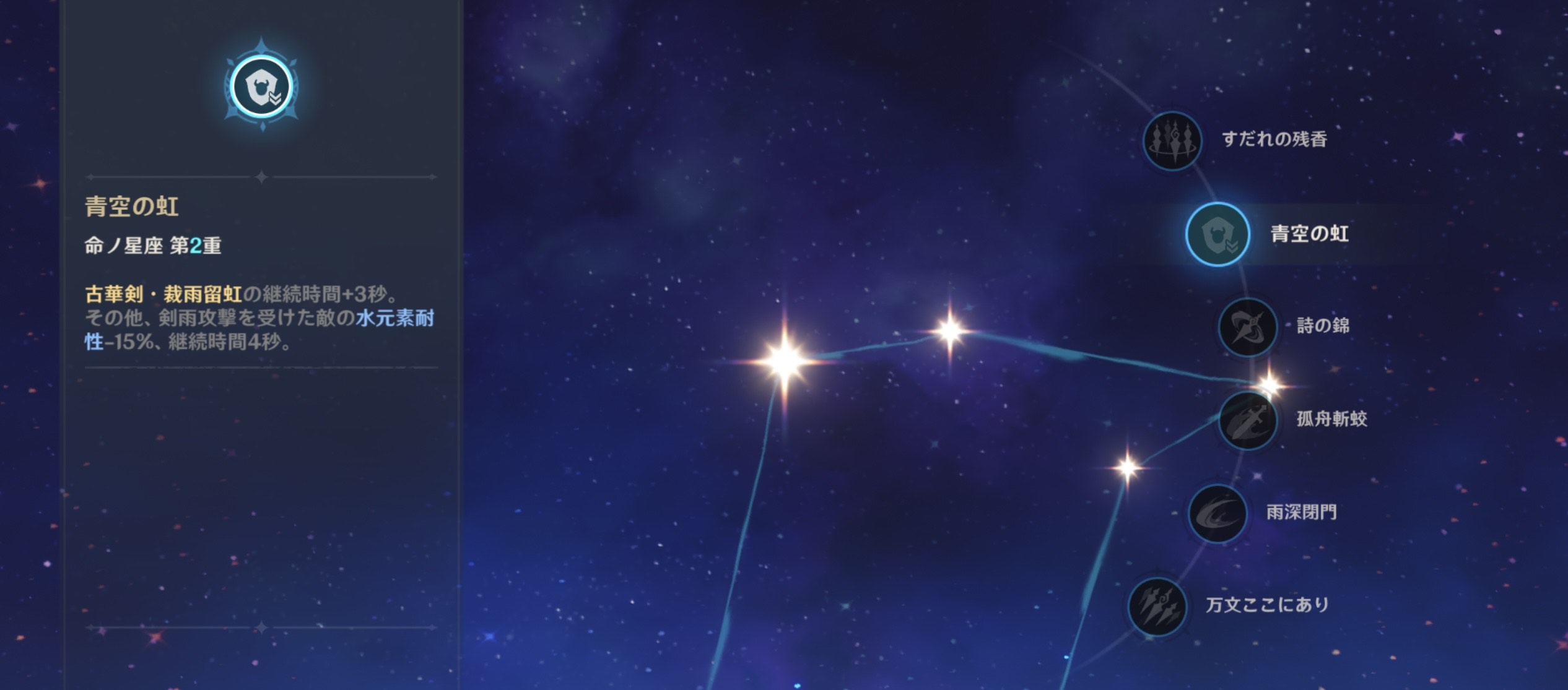 2凸効果は『古華剣・裁雨留虹の継続時間+3秒。その他、剣雨攻撃を受けた敵の水元素耐性-15%、継続時間4秒。』元素爆発の効果時間を上げながらデバフを付与できます。