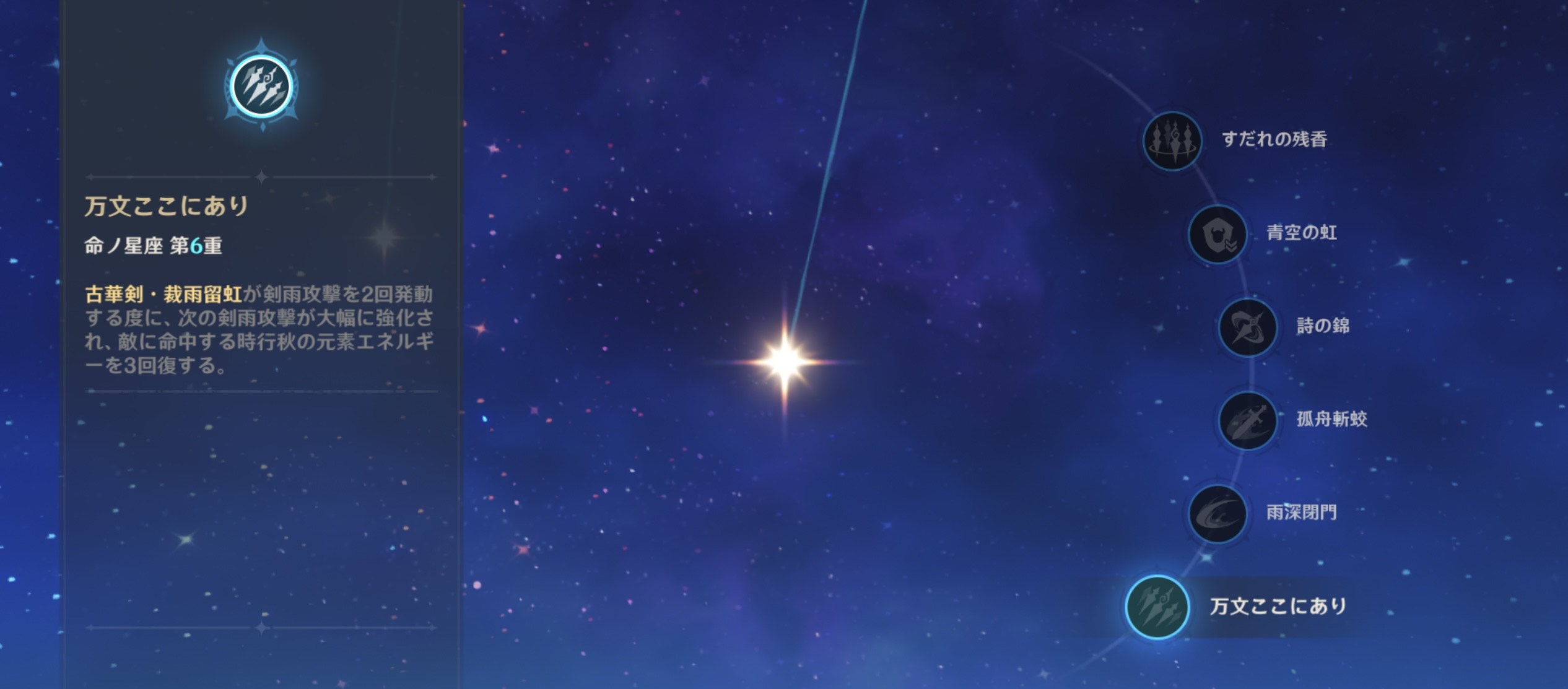 6凸効果は『古花剣・裁雨留虹が剣雨攻撃を2回発動する度に、次の剣雨攻撃が大幅に強化され、敵に命中する時行秋の元素エネルギーを3回復する。』元素爆発のダメージを強化しながら元素エネルギーも供給するというすさまじい性能になっています。本当に星4?