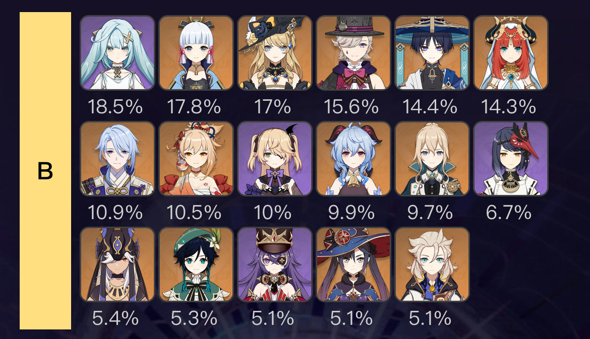 使用率Aまでを見ても様々な元素のアタッカーがランクインしていることから多様性がありそうなことがうかがえますね。