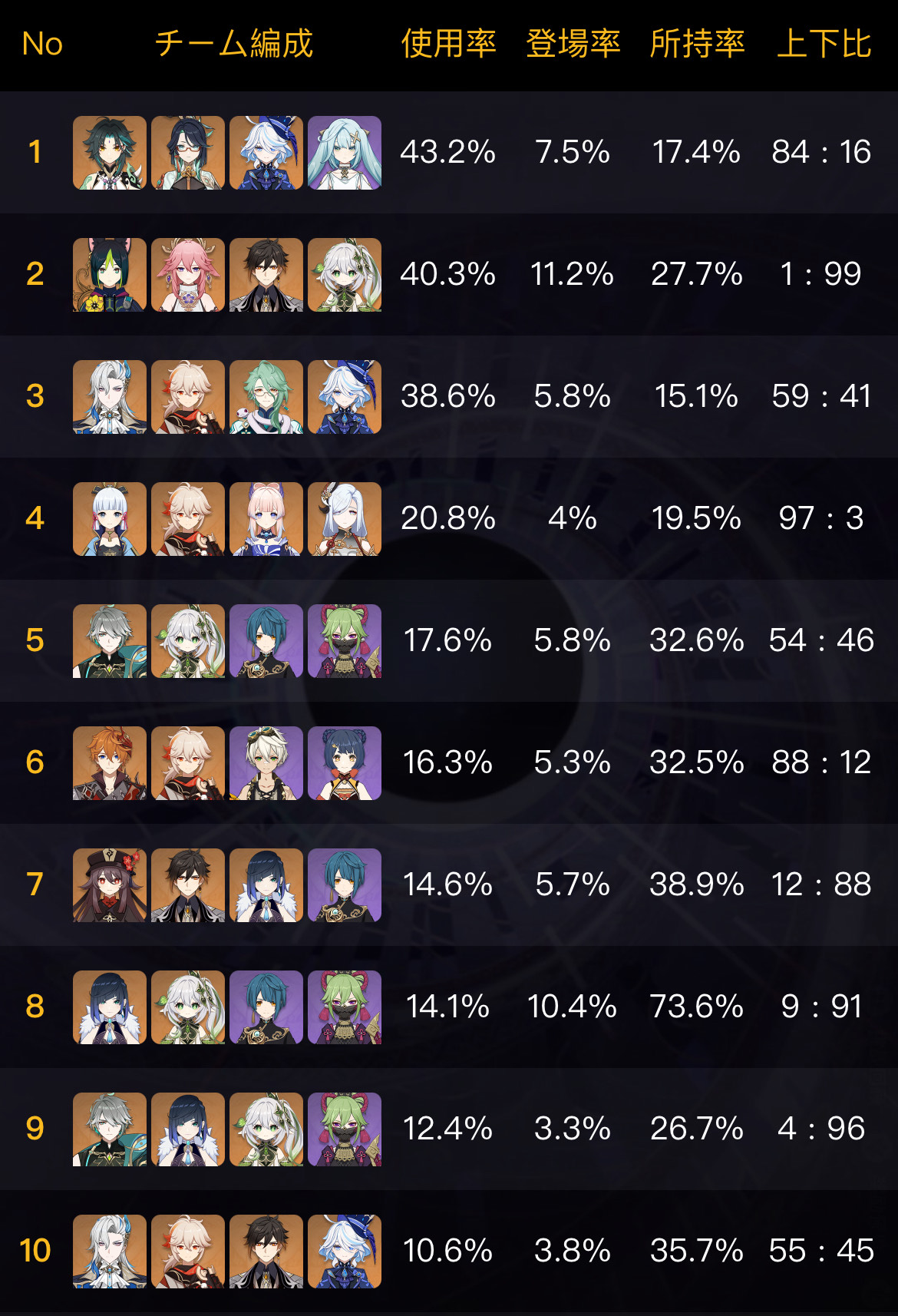 次にパーティー使用率上位10組を見ていきましょう!